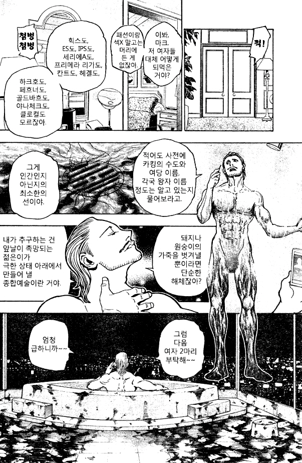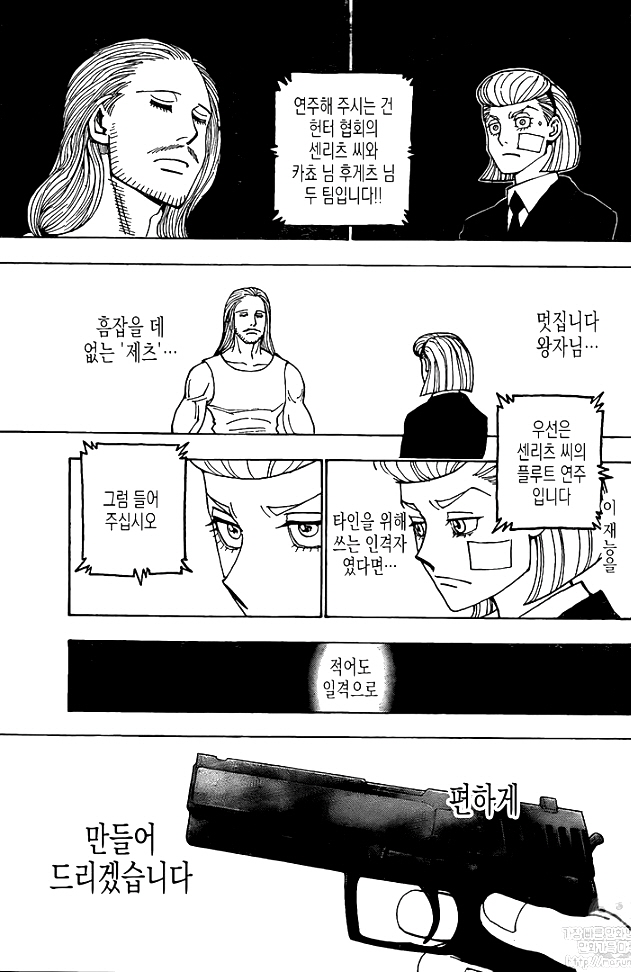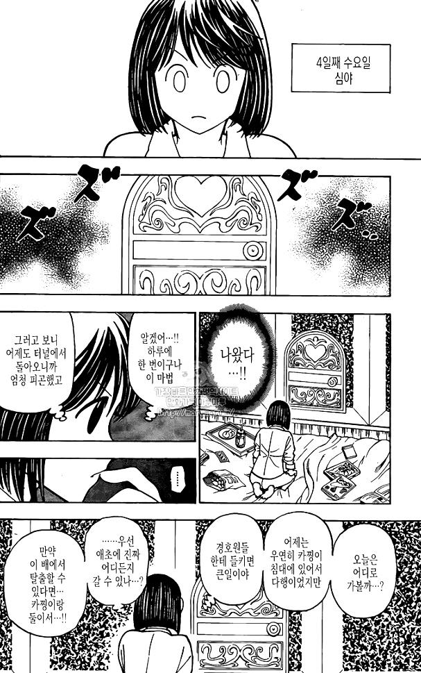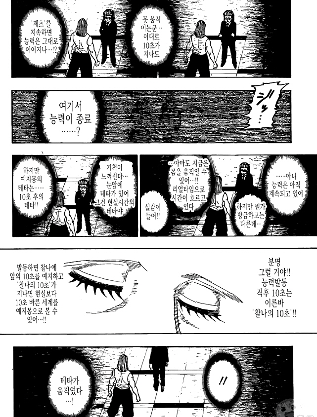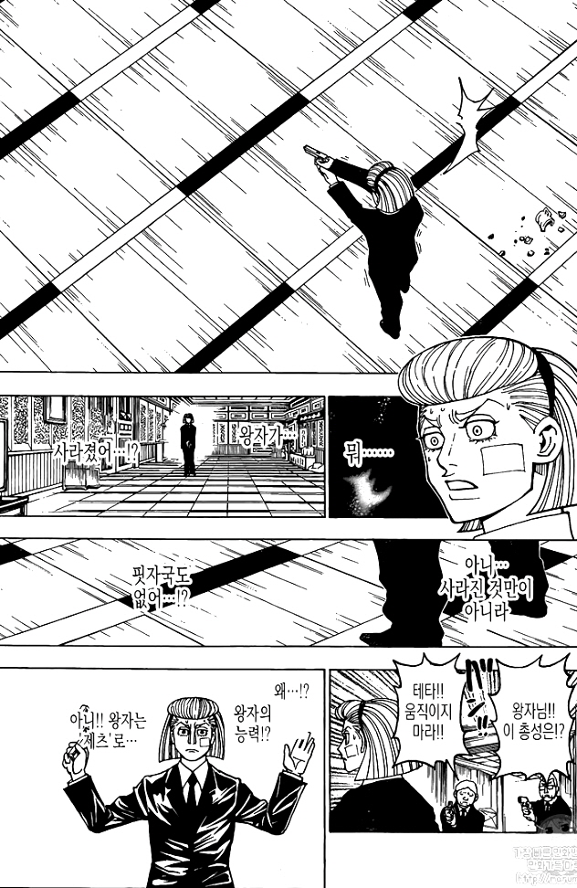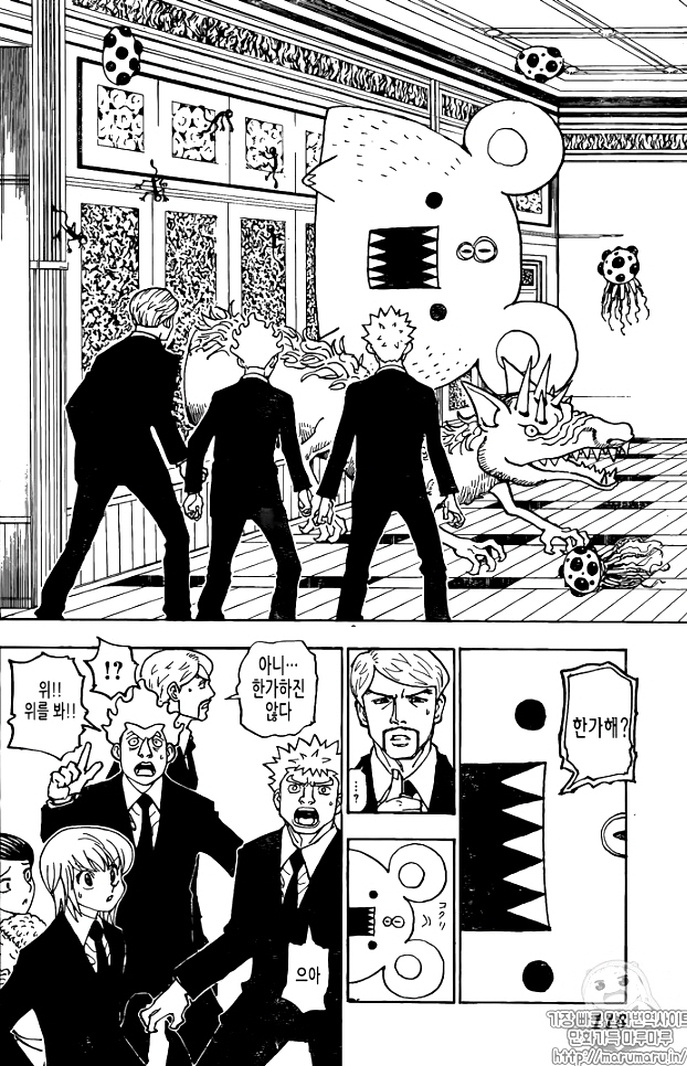 경호원의 몸속에서 나타나는 넨수를 잡기위해 엠페러타임을 발동하는 크라피카. 하지만 넨수를 잡는 것은 실패한다.